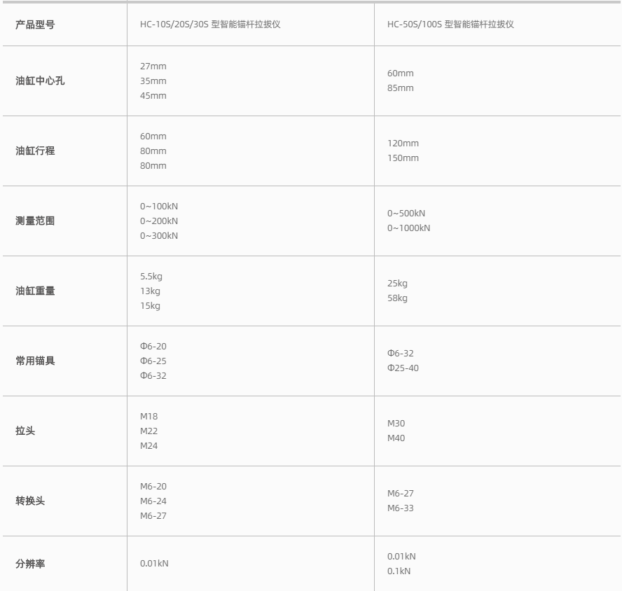 HC-S 系列智能錨桿拉拔儀  HC-10S/20S/30S 型智能錨桿拉拔儀(單油路)  HC-50S/100S 型智能錨桿拉拔儀(雙油路)產(chǎn)品特點及技術(shù)參數(shù)